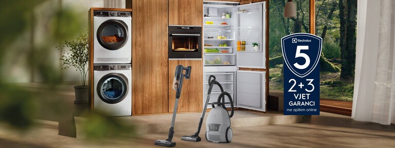 Modelet e përfshira në promovimNëse keni blerë një pianurë, furrë, aspirator, furrë me mikrovalë inkaso, makineri kafeje inkaso, fshesë me korrent, sobë, lavastovilje, frigorifer dhe ngrirës inkaso, lavatriçe, tharëse rrobash, larëse-tharëse rrobash, frigorifer me ngrirës, frigorifer, ngrirës ose një model të caktuar fshese me korrent Electrolux (Garancia e zgjatur për modele të caktuara të fshesave me korrent vertikale vlen për të gjitha pjesët përveç baterisë, e cila mbulohet nga një garanci e rregullt 2-vjeçare) gjatë periudhës prej 1.1.2026 deri më 31.12.2026 merrni një garanci 5-vjeçare për pajisjen me regjistrimin e blerjes online.