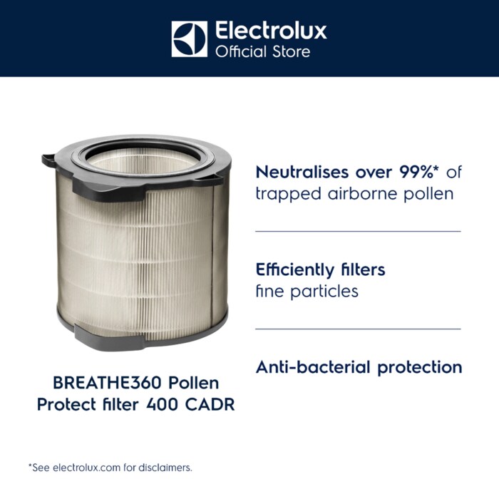 Filtri special BREATHE360 kap e neutralizon mbi 99%* të grimcave të polenit në ajër dhe eleminon, reaksione alergjike kur duhet ndërruar filtri. Fluksi super i lartë i ajrit jep largim të shpejtë të polenit nga ajri i brendshëm që ndihmon mbajtjen, pa polen të shtëpisë.