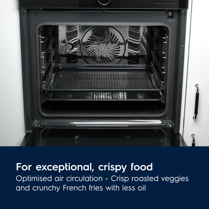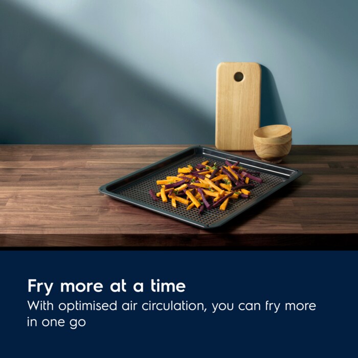 Shijoni pata të skuqura krokante ose zarzavate të shijshme me më pak vaj duke përdorur tavën AirFry të Elektrolux. Është krijuar me vrima më largësi të barabartë për të ofruar rrjedhë të vazhdueshme të ajrit. Kështu që çdo pjatë gatuhet me përsosmëri.