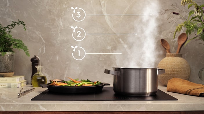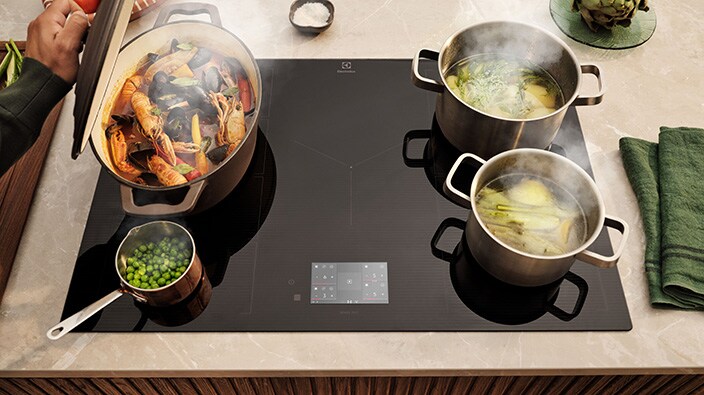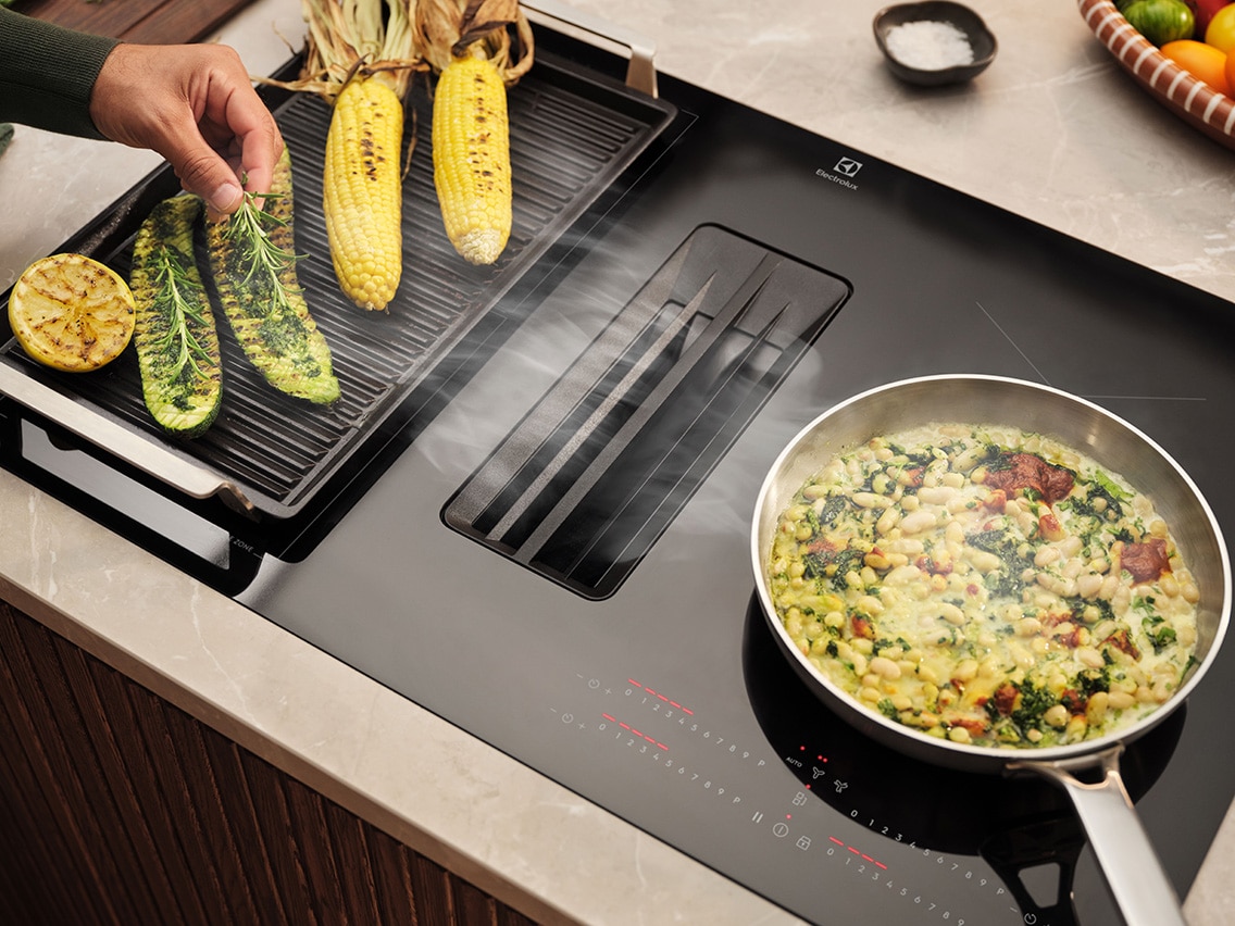 Pianurat me induksion me ventilatorë të integruar të Electrolux ofrojnë si dizajn ashtu edhe funksion në një pajisje të vetme. Ato e mbajnë kuzhinën pa erëra ushqimi, yndyrë dhe avull, duke lejuar fleksibilitet më të madh në dizajnin e kuzhinës.