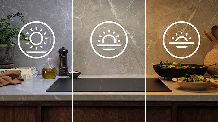 Dritat LED të errësueshme ndriçojnë të gjithë sipërfaqen e gatimit, duke ofruar shikueshmëri të jashtëzakonshme. Rregullo intensitetin dhe temperaturën e dritës nga e ftohtë në të ngrohtë për kombinimin tënd të përsosur.