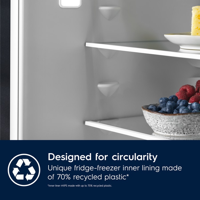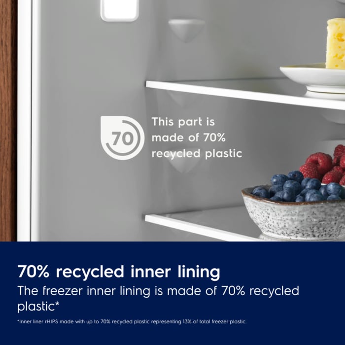 *Pareti i brendshëm rHIPS i bërë me deri në 70% të plastikës së ricikluar që përfaqëson 13% të plastikës gjithsej të frigoriferit”