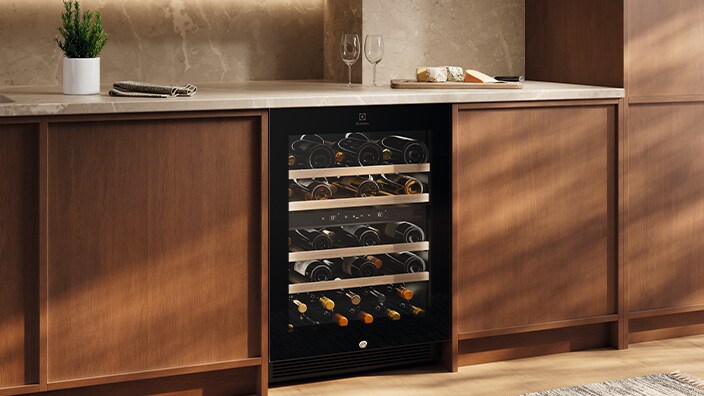 Shfaq koleksionin tënd të verërave me rafte druri cilësore dhe kontroll të temperaturës që i përshtaten madhësisë së shisheve dhe ruajnë shijen.