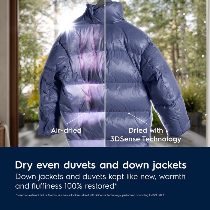Tharёsja 800 UltraCare me pompё ngrohjeje pёrdor teknologjinё tonё 3DSense pёr ta zbuluar lagёshtinё në thellësi për t'i tharë rrobat me precizion dhe kujdes. Edhe artikujt mё tё trashё si jorganët ose xhaketa e mbushura thahen dhe ruhen më së miri duke ruajtur fryrjen dhe ngrohtёsinё.