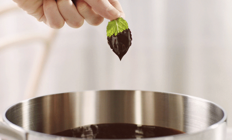 Për një freski pas ushqimit, pastroni qiellzën tuaj me një kënaqësi të thjeshtë: gjethe menteje të ngrira të zhytura në çokollatë. Ato janë të shkëlqyera kur konsumohen më vete ose si garniturë për ëmbëlsira të tjera si akulloret dhe kekët. Shkrirja e çokollatës me nxehtësi delikate është e thjeshtë me një pianurë me induksion, prandaj merrni rezultate të njëjta me profesionistët pa përdorur metodat e komplikuara si souse-vide. Pse të mos provoni edhe gjethe të tjera për një përvojë të ndryshme? Sugjerojmë borzilokun, sherbelën dhe lulet e livandos.